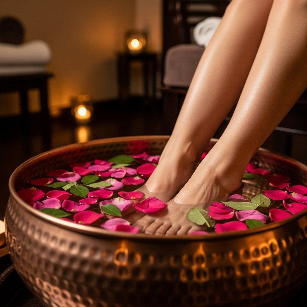 Fresh soak petals, trimming, buffing, cuticle grooming, callus treatment, sugar scrub, paraffin wax, hot stone massage, clay mask with warm towel wrap, relaxing lotion massage, and polish finish.